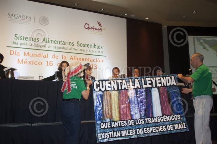 MÉXICO, D.F., 16OCTUBRE2013.- Integrantes Asociación Ambientalista Guerreros Verdes se manifestaron con una manta que se opone a la siembra de maíz transgénicos se manifestaron durante la foro "Sistemas Alimentarios Sostenibles. Una política integral de seguridad alimentaria y nutricional" en el marco del Día Mundial de la Alimentación, evento inaugurado por el secretario de Agricultura Enrique Martínez y Martínez. FOTO: MOISÉS PABLO /CUARTOSCURO.COM