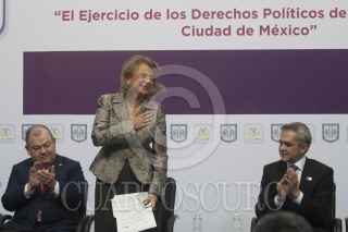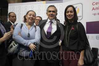 MÉXICO, D.F., 17OCTUBRE2013.- Miguel Ángel Mancera, Jefe de Gobierno, se toma la foto con la cabaretera Ana Francis y la actriz Gabriela Garza, al finalizar la ceremonia conmemorativa del 60 Aniversario del Sufragio Femenino en el Antiguo Palacio del Ayuntamiento. FOTO: MOISÉS PABLO /CUARTOSCURO.COM