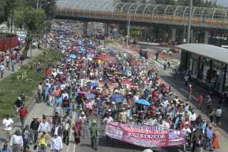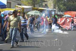 MÉXICO, D.F., 17OCTUBRE2013.- Maestros de la Coordinadora Nacional de Trabajadores de la Educación marcharon del Monumento a la Revolución con rumbo a la Cámara de Diputados, cuando los profesores pasan por el Eje 1 Norte por Tepito algunos locatarios del barrio bravo agredieron algunos manifestantes, esto por la molestia que causaron los cuetones que lanzaron al paso del contingente. FOTO: LUIS CARBAYO /CUARTOSCURO.COM