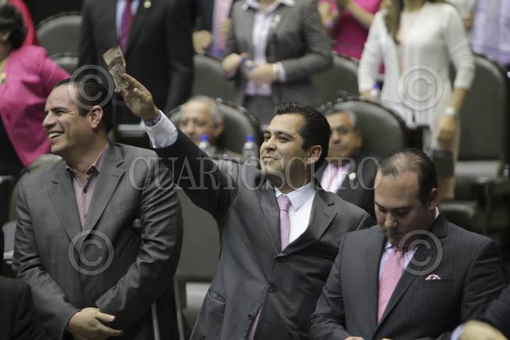 MÉXICO, D.F., 17OCTUBRE2013.- Andrés de la Rosa, diputados del PAN, le muestra un recorte de un diario con donde hace mención de una declaración del diputado del PRI, Manlio Fabio Beltrones, durante la sesión en la cámara de diputados donde se voto en lo general la Reforma Hacendaria. FOTO: GUILLERMO PEREA /CUARTOSCURO.COM