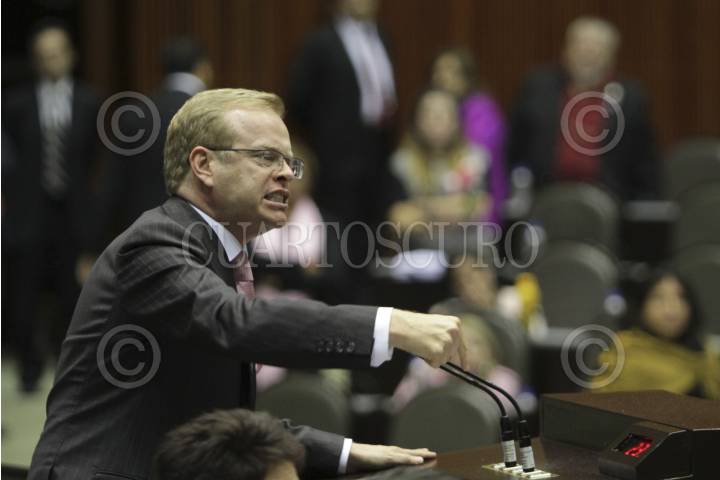 MÉXICO, D.F., 17OCTUBRE2013.- Andrés de la Rosa, diputados del PAN, le muestra un recorte de un diario con donde hace mención de una declaración del diputado del PRI, Manlio Fabio Beltrones, durante la sesión en la cámara de diputados donde se voto en lo general la Reforma Hacendaria. FOTO: GUILLERMO PEREA /CUARTOSCURO.COM