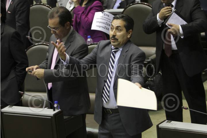 MÉXICO, D.F., 17OCTUBRE2013.- Andrés de la Rosa, diputados del PAN, le muestra un recorte de un diario con donde hace mención de una declaración del diputado del PRI, Manlio Fabio Beltrones, durante la sesión en la cámara de diputados donde se voto en lo general la Reforma Hacendaria. FOTO: GUILLERMO PEREA /CUARTOSCURO.COM