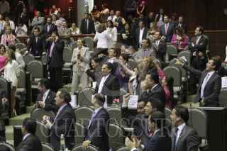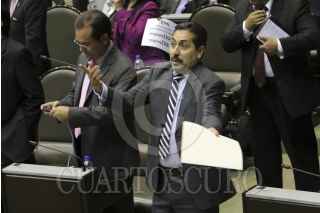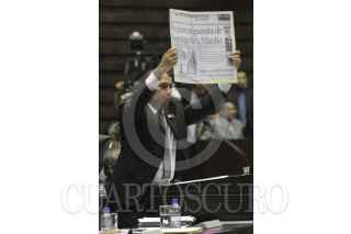 MÉXICO, D.F., 17OCTUBRE2013.- Andrés de la Rosa, diputados del PAN, le muestra un recorte de un diario con donde hace mención de una declaración del diputado del PRI, Manlio Fabio Beltrones, durante la sesión en la cámara de diputados donde se voto en lo general la Reforma Hacendaria. FOTO: GUILLERMO PEREA /CUARTOSCURO.COM