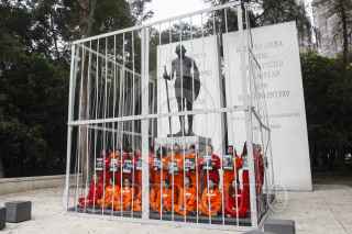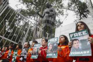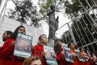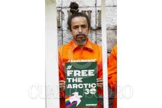 MÉXICO, D.F., 18OCTUBRE2013.- Integrantes de Greenpeace México, acompañado de Rubén Albarran, vocalista de Café Tacuva, realizaron en el Monumento a Gandhi un acto de solidaridad con los 28 activistas de la organización y 2 periodistas independientes que hoy cumplen 30 días de detención en Rusia, quienes son acusados por las autoridades de actos de piratería, luego de que intentaron realizar una protesta pacífica para denunciar los planes de una petrolera de aquel país en el Ártico. FOTO: RODOLFO ANGULO /CUARTOSCURO.COM