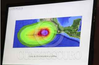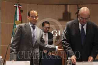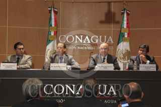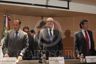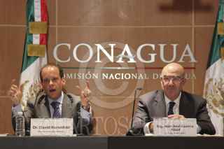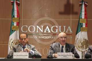 MÉXICO, D.F., 21OCTUBRE2013.- Juan José Guerra Abud, titular de SEMARNAT y David Korenfeld, director general de la Comisión Nacional del Agua, en conferencia de prensa dieron detalles de la trayectoria del huracán ‘Raymundo’ de categoría 3 que se ubica a 170 kilómetros al sur-suroeste de Zihuatanejo, Guerrero. FOTO: SAÚL LÓPEZ /CUARTOSCURO.COM