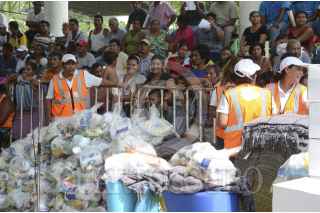 COYUCA DE BENÍTEZ, GUERRERO, 30OCTUBRE2013.- Después del paso de tormenta Manuel y el huracán Raymond, el secretario de Desarrollo Rural de Guerrero, Humberto Zapata Añorve, asistió a municipio de Coyuca de Benítez para otorgar a los damnificados despensas, colchonetas, sarapes, líquidos, bombas aspersoras, semillas mejoradas y recursos para los campesinos que perdieron sus cosechas de plátano, café, mango y coco. Durante el evento, hubo protestas con pancartas de damnificados de Las Lomas que no han sido considerados en el padrón de beneficiarios y no recibieron la tarjeta para la adquisición de enseres y el recurso de empleo temporal. FOTO: BERNANDINO HERNÁNDEZ /CUARTOSCURO.COM