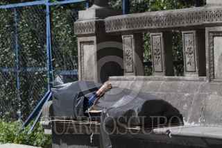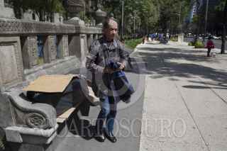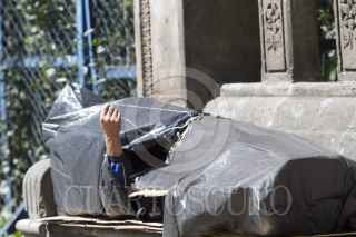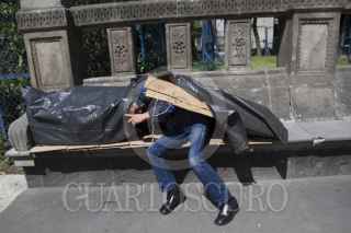 MÉXICO D.F., 03NOVIEMBRE2013.- Un persona sale de entre cartones y plásticos, que están colocados una de las bancas en avenida Paseo de la Reforma y que dan la impresión de un capullo artificial. FOTO: GUILLERMO PEREA /CUARTOSCURO.COM