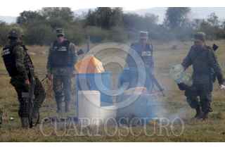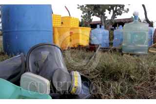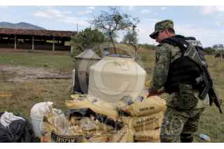 HUANDACAREO, MICHOACÁN, 03NOVIEMBRE2013.- Efectivos del doceavo batallón de infantería, adscritos a la 21 zona militar, localizaron y destruyeron un narco laboratorio para elaborar droga sintética, en las cercanías del lago de Cuitzeo. En dicho lugar, los uniformados encontraron y aseguraron un reactor para procesar droga, 950 gramos de droga sintética terminada, 15 costales de 25 kilos de sosa caustica, cuatro sacos de ácido tartárico de 25 kilos, dos secadoras de ropa y dos exprimidores industriales. Además de esto, encontraron tres tinas de 50 litros con residuos de sustancias químicas, un tinaco Rotoplas de 750 litros, un tanque de gas LP de 30 kilos, cuatro quemadores industriales, 20 botes de 19 litros con residuos químicos, dos macaras antigas, un destilador y un rollo de papel aluminio industrial. FOTO: ALAN ORTEGA /CUARTOSCURO.COM