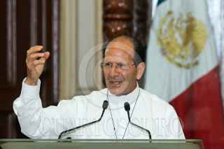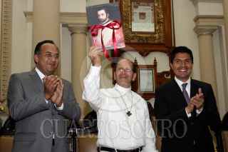 PUEBLA, PUEBLA, 05NOVIEMBRE2013.- El padre Alejandro Solalinde Guerra, quien ha trabajado en defensa de los derechos de los migrantes y es director del albergue “Hermanos en el Camino”, recibió de manos del alcalde de Puebla Eduardo Rivera Pérez, el reconocimiento Juan de Palafox y Mendoza, acto que se llevó acabo en el salón de cabildos del ayuntamiento municipal. FOTO: HILDA RÍOS/ CUARTOSCURO.COM