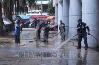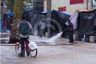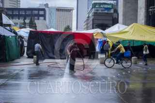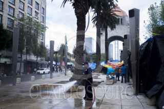 MÉXICO, 07NOVIEMBRE2013.- Trabajadores de la ciudad, comenzaron a limpiar con escobas y mangueras las calles y el circuito del Monumento a la Revolución luego que por la noche los maestros empezaron a compactar mas su Campamento que mantienen desde hace varas semanas en el lugar. FOTO: ENRIQUE ORDÓÑEZ /CUARTOSCURO.COM