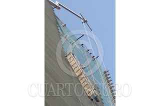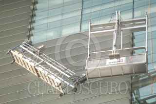 MÉXICO D.F; 08NOVIEMBRE2013.- Dos empleados que laboraban en un andamio limpiando cristales en un edificio, estuvieron a punto de caer al soltarse una de las cuerdas que soportaban este andamio. Los hechos se registraron en el edificio ubicado en la calle Moliere y Miguel de Cervantes Saavedra en la colonia Granada de Miguel Hidalgo. FOTO: LUIS CARBAYO /CUARTOSCURO.COM