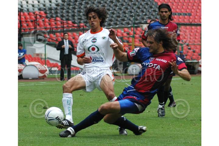 MÉXICO, D.F. 29OCTUBRE2005.- Everaldo Barbosa (Jaguares)diisputa un balón con Daniel Alcántar (Atlante) en el partido de la jornada 14 del torneo de apertura 2005 en el que Atlante y Chiapas empataron a un gol en el Estadio Azteca. FOTO: Iván Stephens/CUARTOSCURO.COM