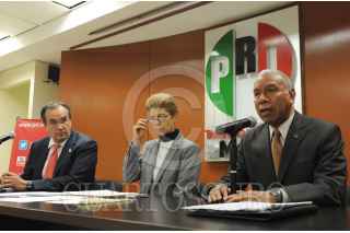MÉXICO, D.F., 11NOVIEMBRE2013.- Alfonso Camacho, secretario de prensa del CEN del PRI, Beatriz Pagés, secretaria de Cultura del Partido Revolucionario Institucional, y el presidente de la Comisión Nacional de Justicia Partidaria, Sadot Sánchez Carreño, dieron a conocer los nombres de los galardonados en las tres categorías de la presea “Sor Juana Inés de la Cruz” que premian a Gerardo Jiménez Sánchez en el rubro de Ciencias; Dolores Castro, en la categoría de Letras; y Enrique Bátiz Campbell, así como Teodoro Cano García, ambos en el área de las Artes. FOTO: CUARTOSCURO.COM