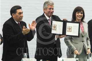 MÉXICO, D.F., 12NOVIEMBRE2013.- Gerardo Ruiz Esparza, Secretario de Comunicaciones y Transporte junto a Yuriria Mascott Pérez, directora general del Servicio Postal Mexicanos, Correos de México, durante la ceremonia que se realizó por el Día del Cartero. FOTO: ENRIQUE ORDÓÑEZ /CUARTOSCURO.COM