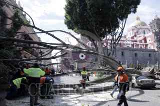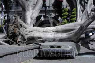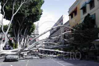 PUEBLA, PUEBLA, 13NOVIEMBRE2013.- Un árbol de mas de 10 metros de altura cayó en el zócalo de la ciudad aplastando un automóvil que se encontraba estacionado en el lugar. Esto debido a las ráfagas de viento que alcanzaron los 70 km/hr en la capital poblana tras la entrada del frente frío número 12 al país. FOTO: HILDA RÍOS/ CUARTOSCURO.COM