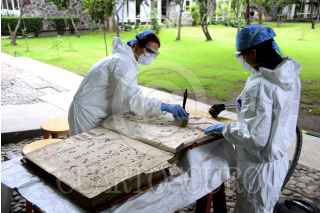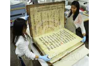MÉXICO, D.F., 13NOVIEMBRE2013.- Especialistas del INAH localizaron una colección de doce volúmenes, transcritos por el fraile agustino Miguel de Aguilar entre 1700 y 1719, que dan cuenta de la técnica de manufactura utilizada a principios del siglo XVIII en la Nueva España. Los libros, que están siendo restaurados para su posterior exhibición en el Museo Nacional del Virreinato, fueron hechos con pergamino, tapas de madera y piel, con medidas de 90 centímetros de largo por 65 cm de ancho. FOTO: MAURICIO MARAT /INAH /CUARTOSCURO.COM