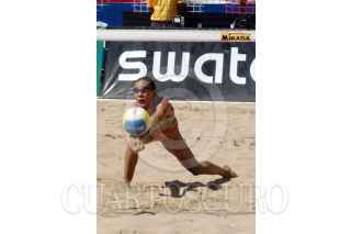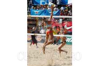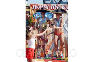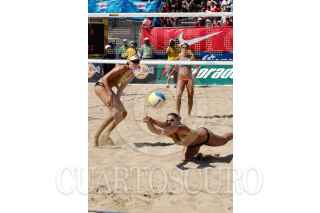 ACAPULCO, GUERRERO 30OCTUBRE2005.- Las ganadoras de Medalla de plata Kerri Walsh y Misty May-Treanor; las brasileñas ganadoras de medalla de oro Juliana Felisberta Silva y Larissa Franca y las ganadoras de medalla de Bronce las estadounidenses Rachel Wacholder y Elaine Youngs al termino de la premiación. FOTO: Eric Miralrío/CUARTOSCURO.COM