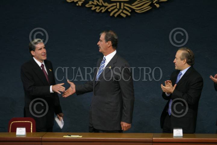 MEXICO, D.F. 31OCTUBRE2005.- Julio Frenk Mora, secretario de Salud y el presidente Vicente Fox altermino de la ceremonia conmemorativa del Día del Médico. FOTO: Nelly Salas/CUARTOSCURO.COM