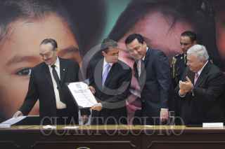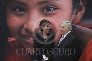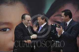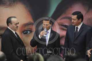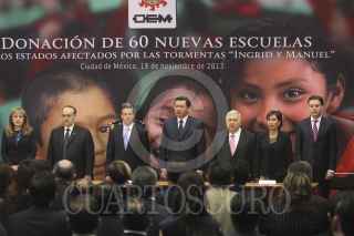 MÉXICO, D.F., 18NOVIEMBRE2013.- Paquita Ramos de Vázquez, Mario Vazquez Raña, director de la OEM, Enrique peña Nieto, presidente de México, Miguel Ángel Osorio Chong, Secretario de Gobernación, Emilio Chuayfett, Secretario de Educación Pública, Rosario Robles, Secretaria de Desarrollo Social y Aurelio Nuño, jefe de oficina de la presidencia, durante la donación de 60 escuelas para los estados afectados por los huracanes Ingrid y Manuel. FOTO: SAÚL LÓPEZ / CUARTOSCURO.COM