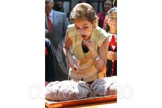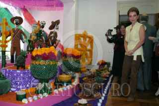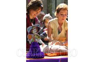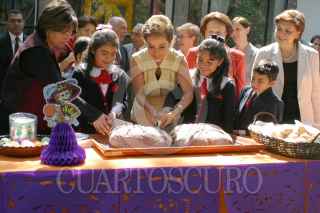 MEXICO, D.F. 31OCTUBRE2005.- Xochil Galvez, comisionada para el desarrollo de los pueblos indigenas, la señora Marta Sahagún y Sari Bermudez compartieron el tradicional pan de muerto con niños de una escuela primaria en la residencia ofial de los Pinos. FOTO: Nelly Salas/CUARTOSCURO.COM
