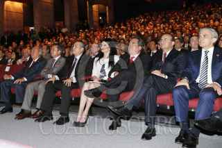 AGUASCALIENTES, AGS, 22NOVIEMBRE2013.- Carlos Romero Deschamps, líder del Sindicato de Trabajadores Petroleros de la República Mexicana; César Camacho Quiroz, presidente nacional del PRI; Manlio Fabio Beltrones, coordinador del partido en la cámara de diputados; Blanca Rivera Río de Lozano, esposa de Carlos Lozano de la Torre, gobernador de Aguascalientes; Alfonso Navarrete Prida, secretario de Trabajo y Previsión Social; y Miguel Ángel Mancera, jefe de gobierno del DF, durante el Tercer Informe de Gobierno del estado. FOTO: DIPUTADOS / CUARTOSCURO.COM