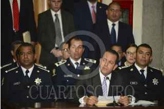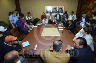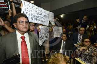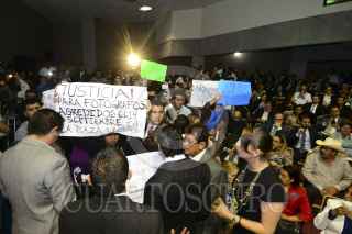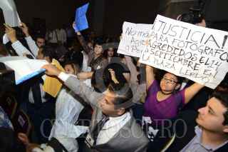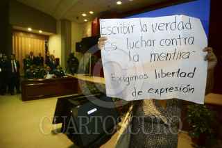 XALAPA, VERACRUZ., 22NOVIEMBRE2013.- Reporteros y fotógrafos de distintos medios de comunicación en el estado se manifestaron durante la comparecencia del Secretario de Seguridad Publica Arturo Bermúdez Zurita en el congreso local, los comunicadores alzaron sus pancartas en donde se observaban frases como "Escribir la verdad es luchar contra la mentira", minutos después personas vestidas de civil arrebataron las pancartas a los periodistas y jalonearon a fotógrafos y reporteros para impedir la protesta. FOTO: RUBÉN ESPINOSA / CUARTOSCURO.COM