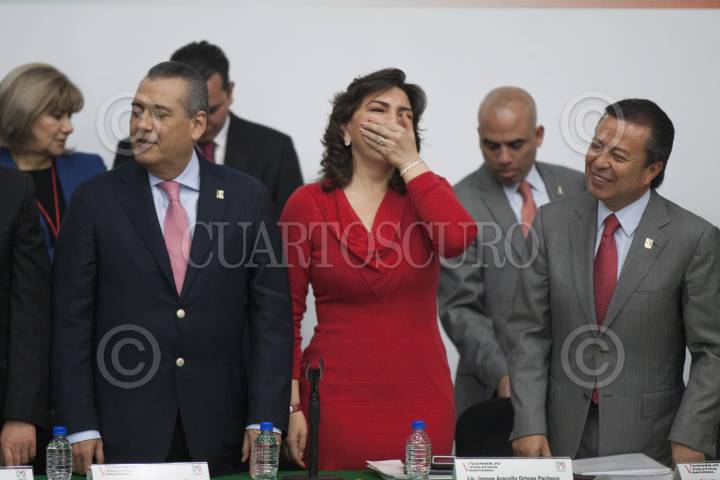 MÉXICO, D.F., 23NOVIEMBRE2013.- Manlio Fabio Beltrones, coordinador de los diputados del PRI, saluda al líder nacional del tricolor César Camacho Quiroz, en medio de ellos la secretaría general del partido Ivonne Ortega durante la sesión de trabajo del V Consejo Político Nacional en la sede nacional del PRI. FOTO: MOISÉS PABLO /CUARTOSCURO.COM