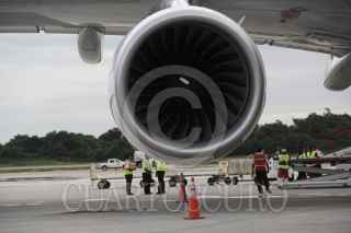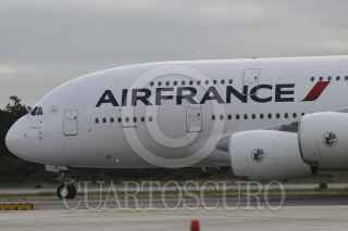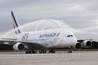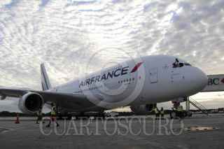 CANCUN, QUINTANA ROO, 27NOVIEMBRE2013.- El avión mas grande del mundo, el a380 de Air France, aterrizó por primera vez en México y América Latina, siendo el Aeropuerto internacional de Cancún donde se recibió esta tarde el vuelo procedente de Francia, el avión tiene una capacidad de 555 pasajeros y hasta 850 cuando se modifican a clase turista, tiene 2 pisos, mide 73 metros de largo y 79 de envergadura, por 24 de alto y se construyo por primera vez en el 2005, fue recibido por autoridades y público que fue invitado a ver este hecho histórico comparado con la llegada del concorde. FOTO: ELIZABETH RUIZ /CUARTOSCURO.COM