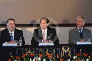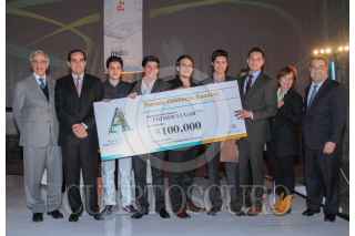 MÉXICO, D.F., 27NOVIEMBRE2013.- Calixto Mateos Hanel, director de Vinculación Institucional del Banco de México, Javier Eduardo Guzmán Calafell, subgobernador del Banco de México y Dionisio Meade y García de León, director general de Relaciones Institucionales del BM, durante la ceremonia de entrega a las escuelas seleccionadas y ganadoras del Premio Contacto Banxico 2013. En la imagen, alumnos de la escuela Colegio Suizo de México, plantel Cuernavaca, ganadores del primer lugar. FOTO: ADOLFO VLADIMIR /CUARTOSCURO.COM