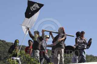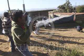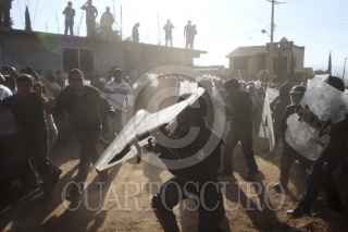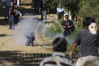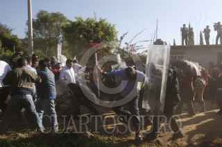 SAN JACINTO AMILPAS, OAXACA, 28NOVIEMBRE2013.- Profesores de la Sección 22 de la CNTE apoyados por el FPR, FUL-APPO y anarquistas recuperaron mediante la fuerza la escuela primaria Hermanos Flores Magón, el jardín de niños Donají y el módulo de la secundaria Técnica de la colonia Los Ángeles. Los mentores se enfrentaron por casi 30 minutos con padres de familia y colonos quienes utilizaron bombas molotov, cohetones y piedras, durante la refriega resultaron por lo menos seis personas heridas, tres colonos de los que dos estuvieron retenidos, un policía estatal también retenido y dos profesores. FOTO: ARTURO PÉREZ ALFONSO/CUARTOSCURO.COM