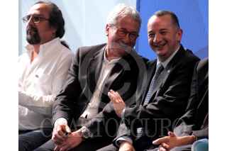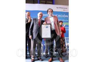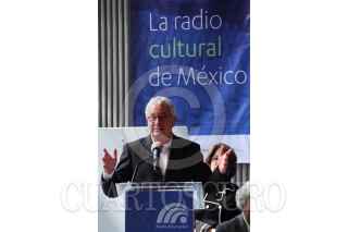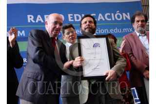 MÉXICO, D.F., 04NOVIEMBRE2013.- Edmundo Cepeda Delgado, recibe el reconocimiento "José Vasconcelos" al mérito en la radio pública, de manos José Luis Martínez, en representación del secretario de Educación Pública, durante la ceremonia por el 89 aniversario de Radio Educación. FOTO: ADOLFO VLADIMIR /CUARTOSCURO.COM