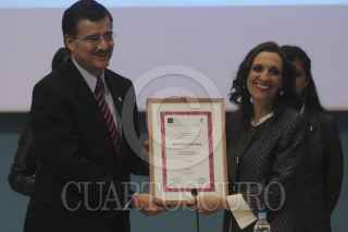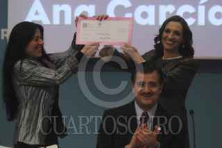 GUADALAJARA, JALISCO, 04DICIEMBRE2013.-En el marco de la edición 27 de la Feria Internacional del libro en Guadalajara, que se lleva a cabo en la Expo de esta ciudad, se hizo entrega del XXI Premio de Literatura Sor Juana Inés de la Cruz 2013 a la escritora mexicana Ana García Bergua. FOTO: FERNANDO CARRANZA GARCIA /CUARTOSCURO.COM