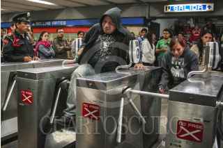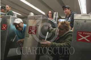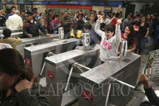 MÉXICO, D.F., 11DICIEMBRE2013.- Un grupo de jóvenes con pancartas en mano y gritando consignas ante el alza de la tarifa del Metro de 3 a 5 pesos abrió los torniquetes de la entrada a la estación Bellas Artes para que los usuarios pasaran gratis. FOTO: ENRIQUE ORDÓÑEZ /CUARTOSCURO.COM