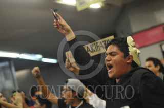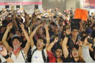 MÉXICO, DF., 13DICIEMBRE2013.- Jóvenes que habían marchado por Paseo de la Reforma, terminaron manifestándose en la estación del metro Insurgentes en protesta por el aumento de la tarifa del Sistema de Transporte Colectivo Metro. La multitud dejo pasar gratis a todas las personas que pasaban por el lugar. FOTO: DIEGO SIMÓN SÁNCHEZ /CUARTOSCURO.COM