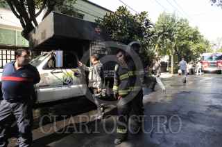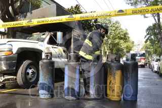 MÉXICO D.F; 15DICIEMBRE2013.- Un camión repartidor de cilindros de gas, se incendio, al parecer por fumar a bordo del mismo uno de los trabajadores. El accidenten se registro en calle Canarias y Víctor Hugo de la colonia Portales, hasta donde arribaron bomberos para controlar las llamas que dejaron como saldo, dos personas lesionadas por quemaduras. FOTO: LUIS CARBAYO /CUARTOSCURO.COM