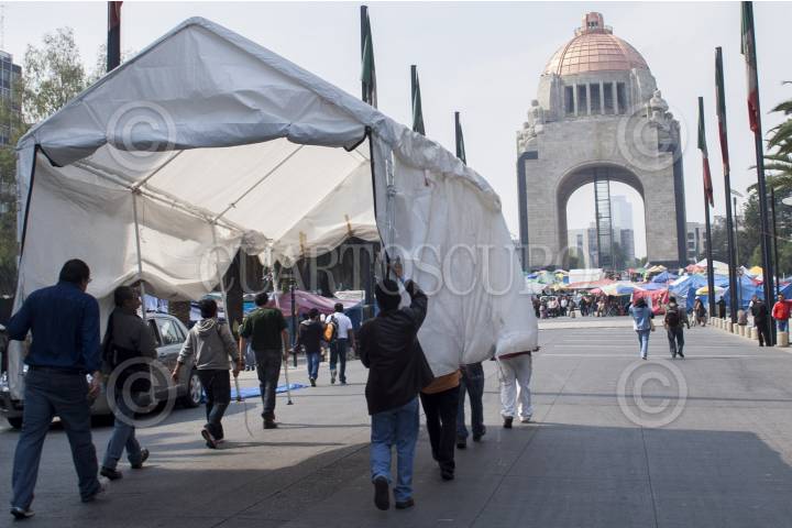 MÉXICO, D.F., 23DICIEMBRE2013.- Trabajadores de la Coordinadora Nacional de Trabajadores de la Educación que se encontraban en los alrededores de las calles que se ubican en el Monumento a la Revolución, se re-ubicaron en el interior de la Plaza para dejar el espacio en las banquetas luego de un acuerdo que realizaron con los maestros de Veracruz. FOTO: ENRIQUE ORDÓÑEZ /CUARTOSCURO.COM