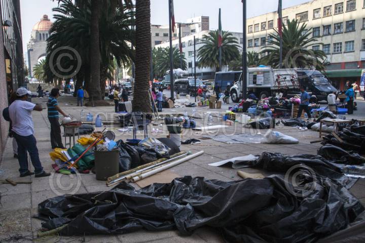 MÉXICO, D.F., 23DICIEMBRE2013.- Trabajadores de la Coordinadora Nacional de Trabajadores de la Educación que se encontraban en los alrededores de las calles que se ubican en el Monumento a la Revolución, se re-ubicaron en el interior de la Plaza para dejar el espacio en las banquetas luego de un acuerdo que realizaron con los maestros de Veracruz. FOTO: ENRIQUE ORDÓÑEZ /CUARTOSCURO.COM