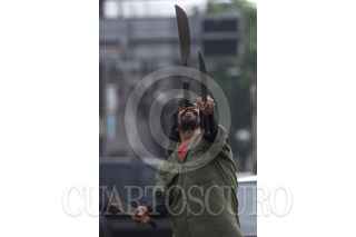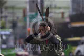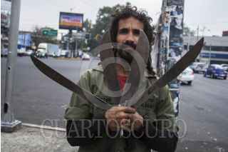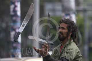 MÉXICO, D.F., 24DICIEMBRE2013.- Efrain, un artista urbano de la Ciudad, realiza una serie de malabares sobre la Glorieta de Camarones con cuatro machetes, durante el alto de los carros que pasan por el lugar para así poder ganar unas monedas que los conductores y acompañantes del dan al ver la peligrosidad y destreza con la que maneja los machetes. Durante el día Efrain permanece unas cuantas horas en la glorieta antes de partir a su casa o ver a su novia con la cual este día pasara las fiestas Navideñas. FOTO: ENRIQUE ORDÓÑEZ /CUARTOSCURO.COM