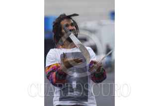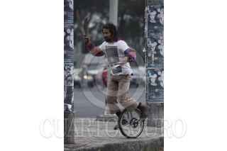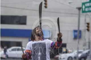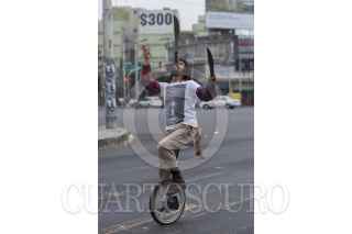 MÉXICO, D.F., 27DICIEMBRE2013.- Efrain, un artista urbano, monta un acto con un monociclo y machetes en la Glorieta de Camarones donde día a día se juega la vida para poder conseguir fondos y cubrir sus necesidades diarias. FOTO: ENRIQUE ORDÓÑEZ /CUARTOSCURO.COM