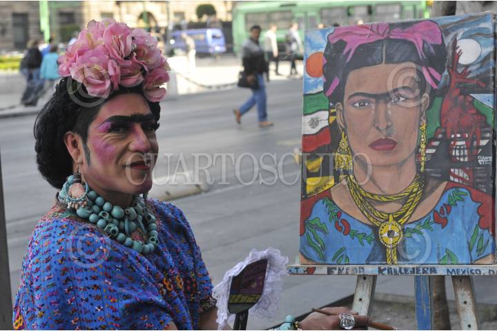 MÉXICO, D.F., 28DICIEMBRE2013.- Un hombre disfrazado de la pintora Frida Khalo se gana unas monedas sobre la calle Juárez frente al Palacio de Bellas Artes. FOTO: DIEGO SIMÓN SÁNCHEZ /CUARTOSCURO.COM