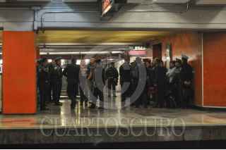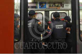 MÉXICO, D.F., 29DICIEMBRE2013.- Gran cantidad de policías resguardan las instalaciones del metro para evitar el comercio informal. Vendedores ambulantes continuan trabajando en los convoyes dentro de las instalaciones de la Línea 1 del metro. Los comerciantes trabajan de forma más discreta, no le suben tanto el volumen a sus bocinas, esconden sus productos en bolsas negras y a veces se suben en parejas al convoy. FOTO: DIEGO SIMÓN SÁNCHEZ /CUARTOSCURO.COM