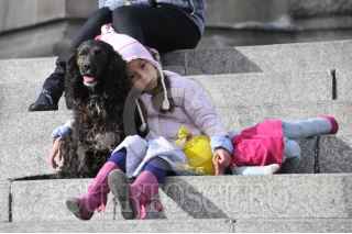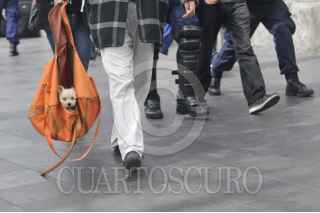 MÉXICO, D.F., 29DICIEMBRE2013.- Viajando dentro de una mochila, un cachorro es paseado por una persona que camina por el zócalo capitalino. FOTO: DIEGO SIMÓN SÁNCHEZ /CUARTOSCURO.COM
