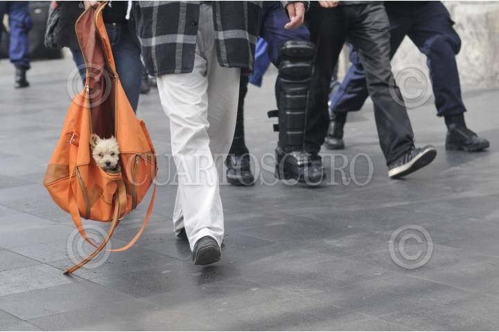 MÉXICO, D.F., 29DICIEMBRE2013.- Viajando dentro de una mochila, un cachorro es paseado por una persona que camina por el zócalo capitalino. FOTO: DIEGO SIMÓN SÁNCHEZ /CUARTOSCURO.COM