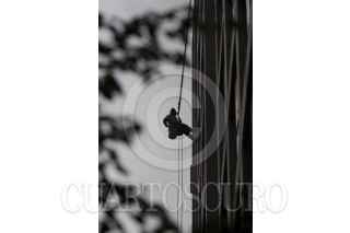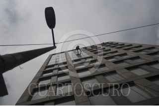 MÉXICO, D.F., 31DICIEMBRE2013.- Un limpia vidrios realiza su labor a más de 20 metros de altura en una profesión de alto riesgo donde la protección para quien la realiza consiste en amarrarse a una cuerda y bajar a rápel sin ningún tipo de protección. FOTO: IVÁN STEPHENS /CUARTOSCURO.COM