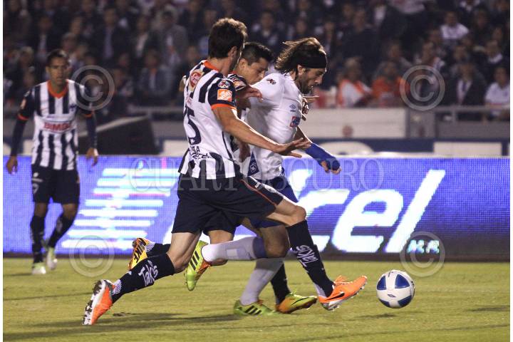 MONTERREY, NUEVO LEÓN, 04ENERO2013.- Omar Arellano del equipo de los Rayados del Monterrey se disputa el balón con Sergio Javier Nápoles de la máquina celeste en la jornada 1 de la clausura de la Liga Clausura 2013 en el estadio tecnológico. Final 0 - 0. FOTO: GABRIELA PÉREZ MONTIEL /CUARTOSCURO.COM