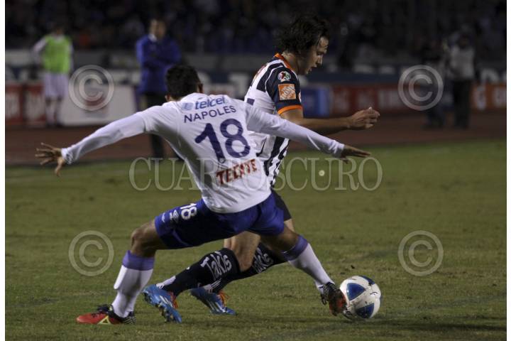 MONTERREY, NUEVO LEÓN, 04ENERO2013.- Omar Arellano del equipo de los Rayados del Monterrey se disputa el balón con Sergio Javier Nápoles de la máquina celeste en la jornada 1 de la clausura de la Liga Clausura 2013 en el estadio tecnológico. Final 0 - 0. FOTO: GABRIELA PÉREZ MONTIEL /CUARTOSCURO.COM