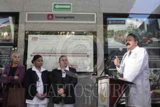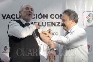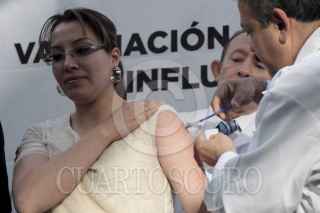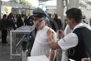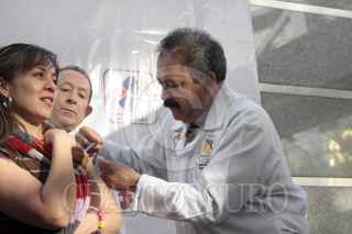 MÉXICO, D.F., 07ENERO2014.- Usuarios del metrobus se inyectan contra la influenza en la estación del Metrobus, esta maña el secretario de Salud Armando Ahued pusó en marcha una campaña de vacunación contra la influenza estacional, AH1N1 y neumococo, en este sistema de transporte público en el cual viajan alrededor de 80 0000 mil pasajeros a diario. La cita fue en la estación Insurgentes en donde el funcionario de sanidad destaco las medidas sanitarias para prevenir enfermedades respiratorias en esta temporada invernal, como lavarse la manos, vacunarse si uno pertenece a un segmento de la población en riesgo y consumir mucha vitamina C. FOTO: MOISÉS PABLO /CUARTOSCURO.COM