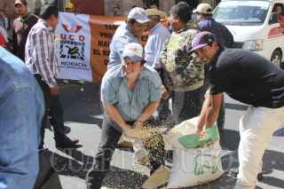 MORELIA, MICHOACÁN, 08DICIEMBRE2014. Al medio día de este miércoles, un grupo de campesinos, miembros del “Barzon” aventaron mazorcas en la entrada del Palacio de Gobierno en Morelia y enfrente de la Secretaría de Agricultura, Ganadería, Desarrollo Rural, Pesca y Alimentación (Sagarpa), donde exigen la intervención de autoridades en la regulación del precio del maíz. FOTO: JUAN JOSÉ ESTRADA SERAFÍN /CUARTOSCURO.COM