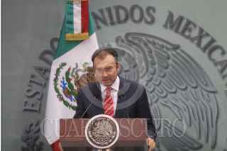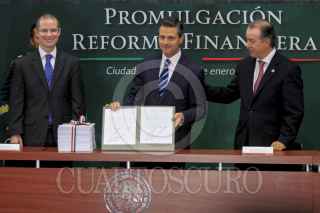 MÉXICO, D.F., 09ENERO2014.- Ricardo Anaya, presidente de la mesa directiva de la Cámara de Diputados, Enrique Peña Nieto, Presidente de México y Raúl Cervantes Andrade, presidente de la mesa directiva de la Cámara de Senadores, durante la firma de promulgación de la Reforma Financiera, en la residencia oficial de Los Pinos. FOTO: MOISÉS PABLO /CUARTOSCURO.COM