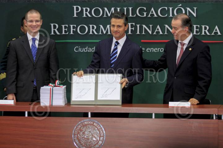 MÉXICO, D.F., 09ENERO2014.- Ricardo Anaya, presidente de la mesa directiva de la Cámara de Diputados, Enrique Peña Nieto, Presidente de México y Raúl Cervantes Andrade, presidente de la mesa directiva de la Cámara de Senadores, durante la firma de promulgación de la Reforma Financiera, en la residencia oficial de Los Pinos. FOTO: MOISÉS PABLO /CUARTOSCURO.COM